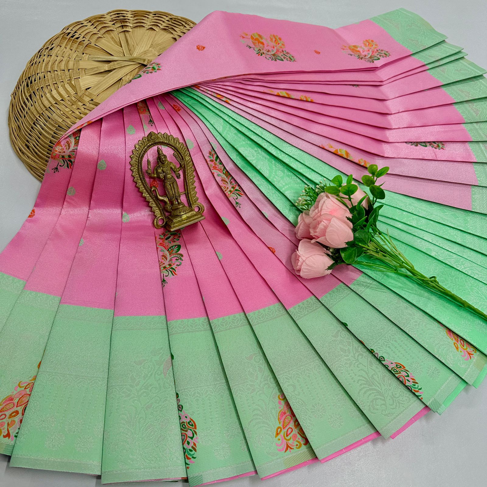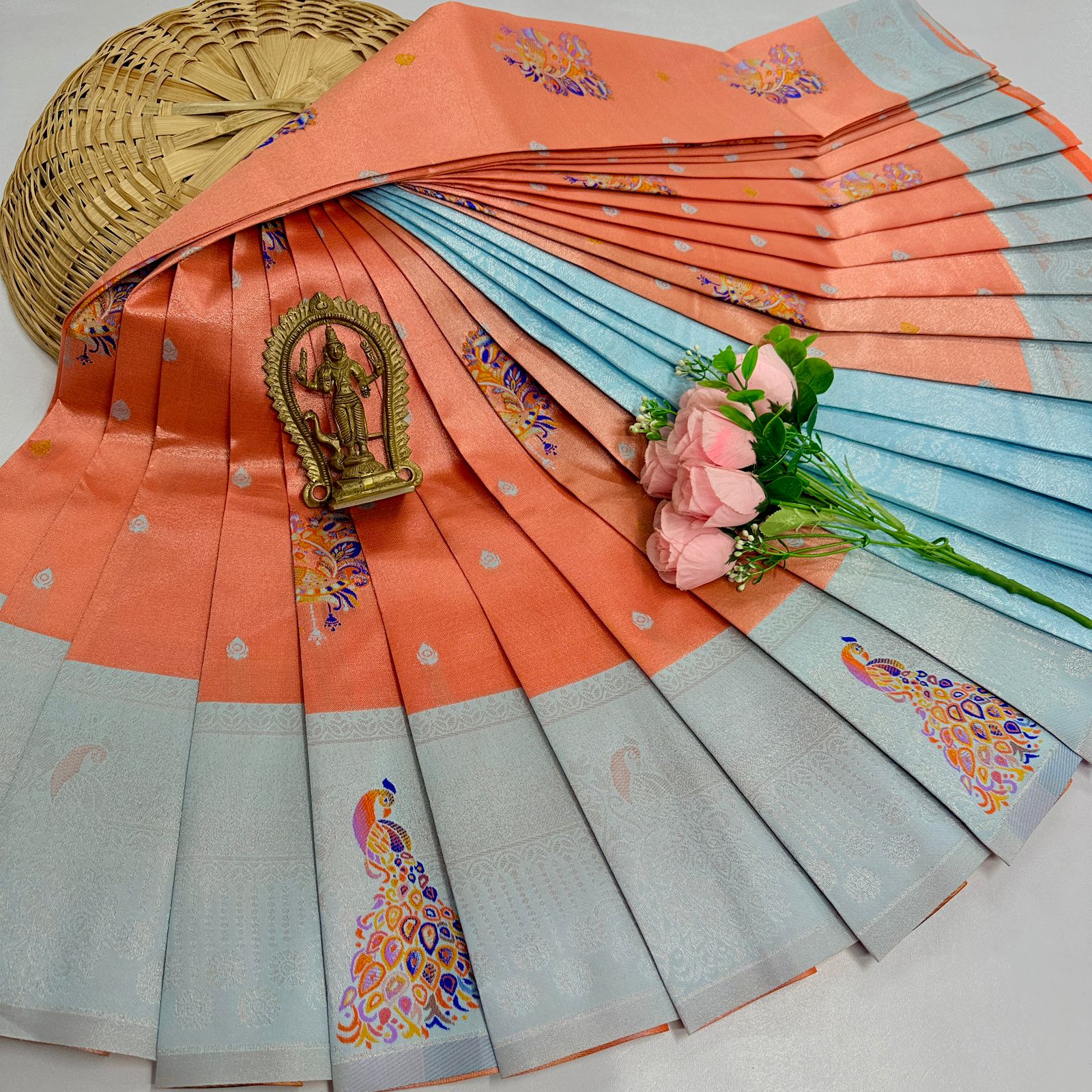 Elite Kupera Korvai bridal rapier silk-type sarees in Samuthrika/Vasthrakala wedding style. Made from premium bridal silk material, featuring 3D embossed rich weaving, rose gold zari, and rich pallu with contrast blouse. Lightweight yet luxurious – a perfect bridal choice. Price: ₹1499 + shipping.