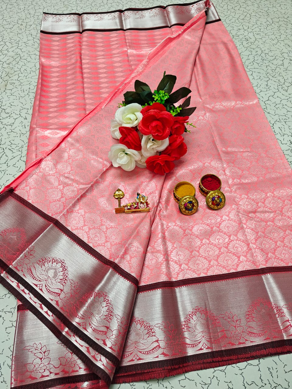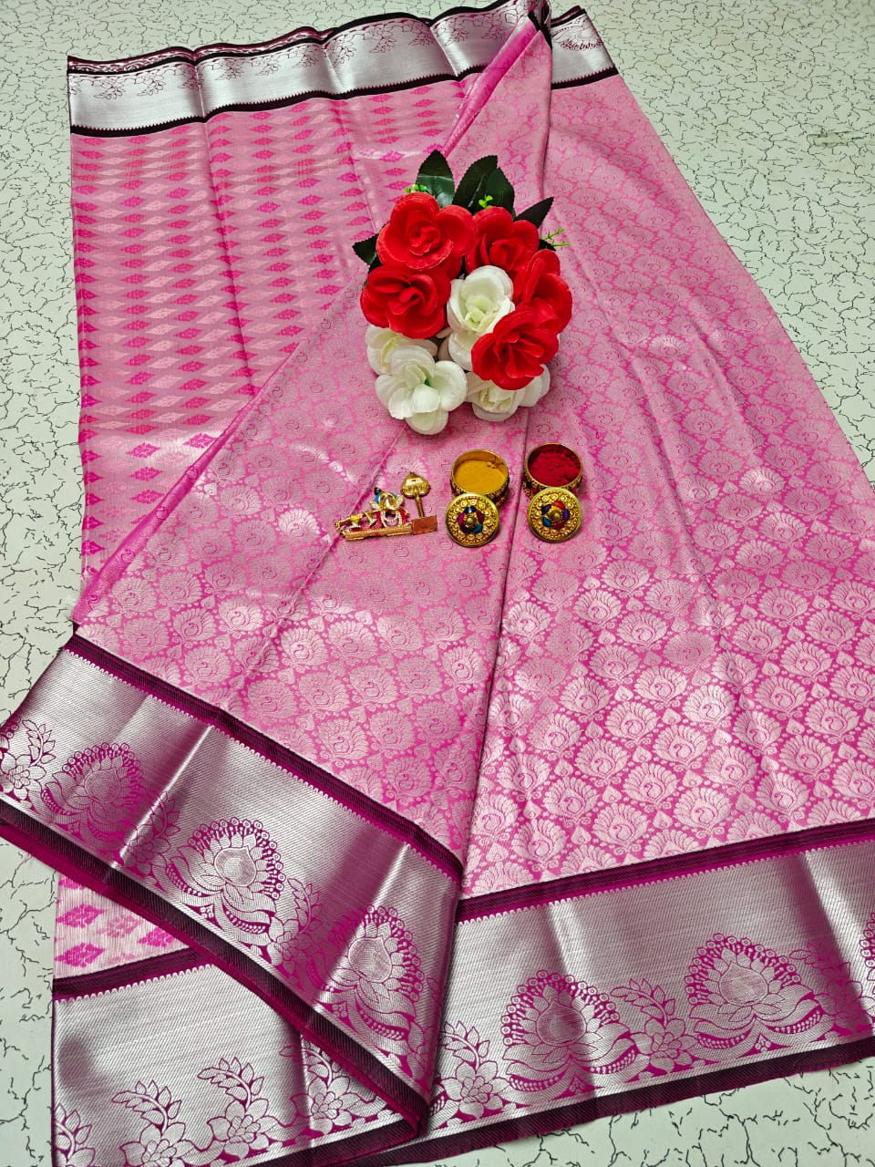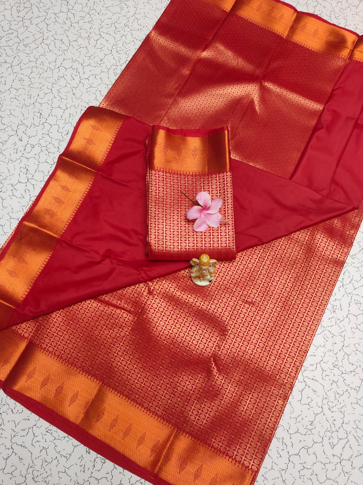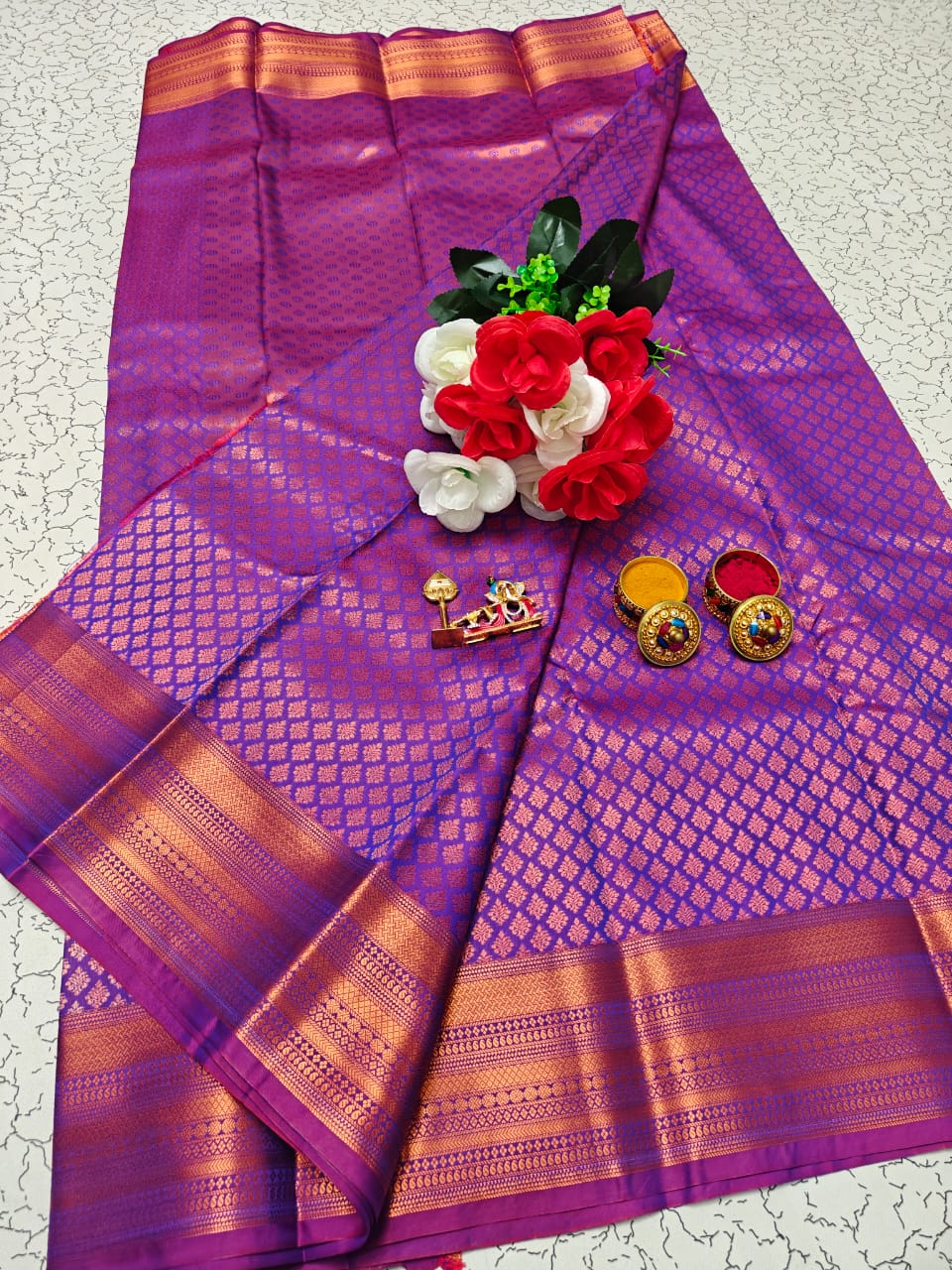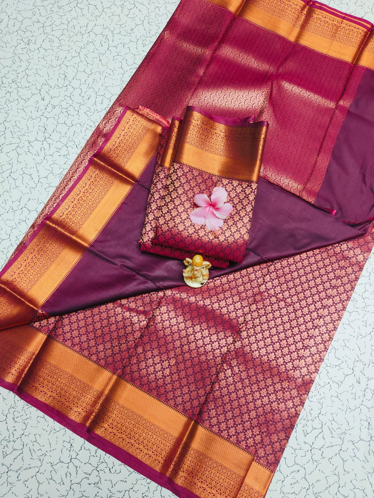 Elite Bridal Fancy Silk Saree crafted in pure bridal-grade silk with Samuthrika/Vasthrakala weave. Features a rich contrasting pallu, intricate gold-silver-copper zari, and comes with a matching 110 Karizma blouse.