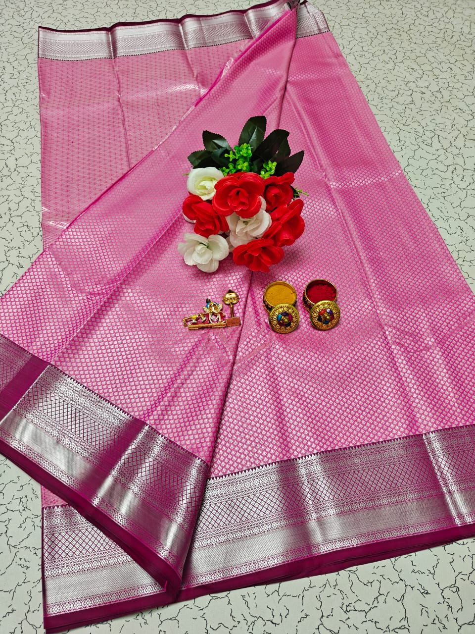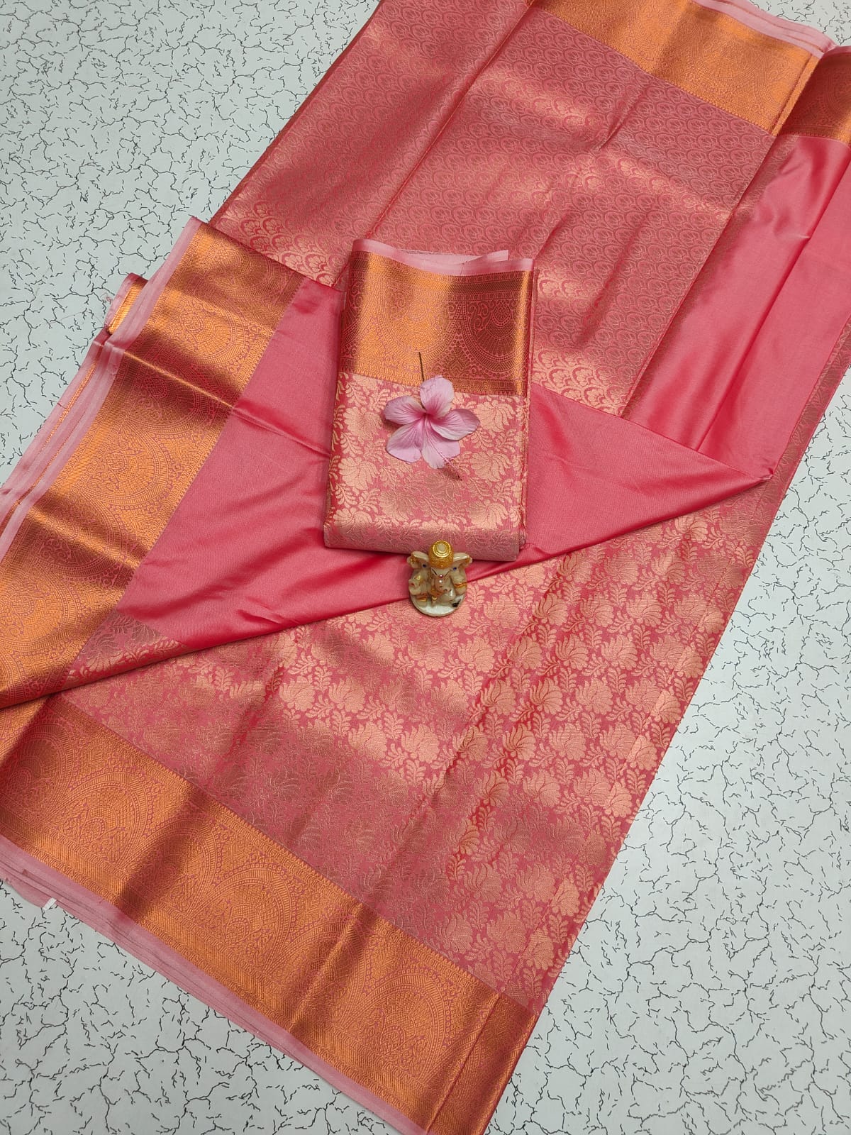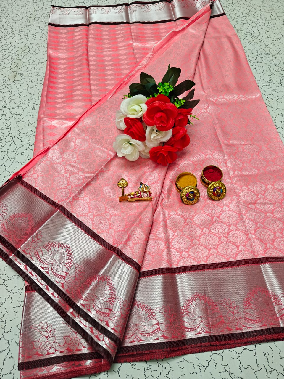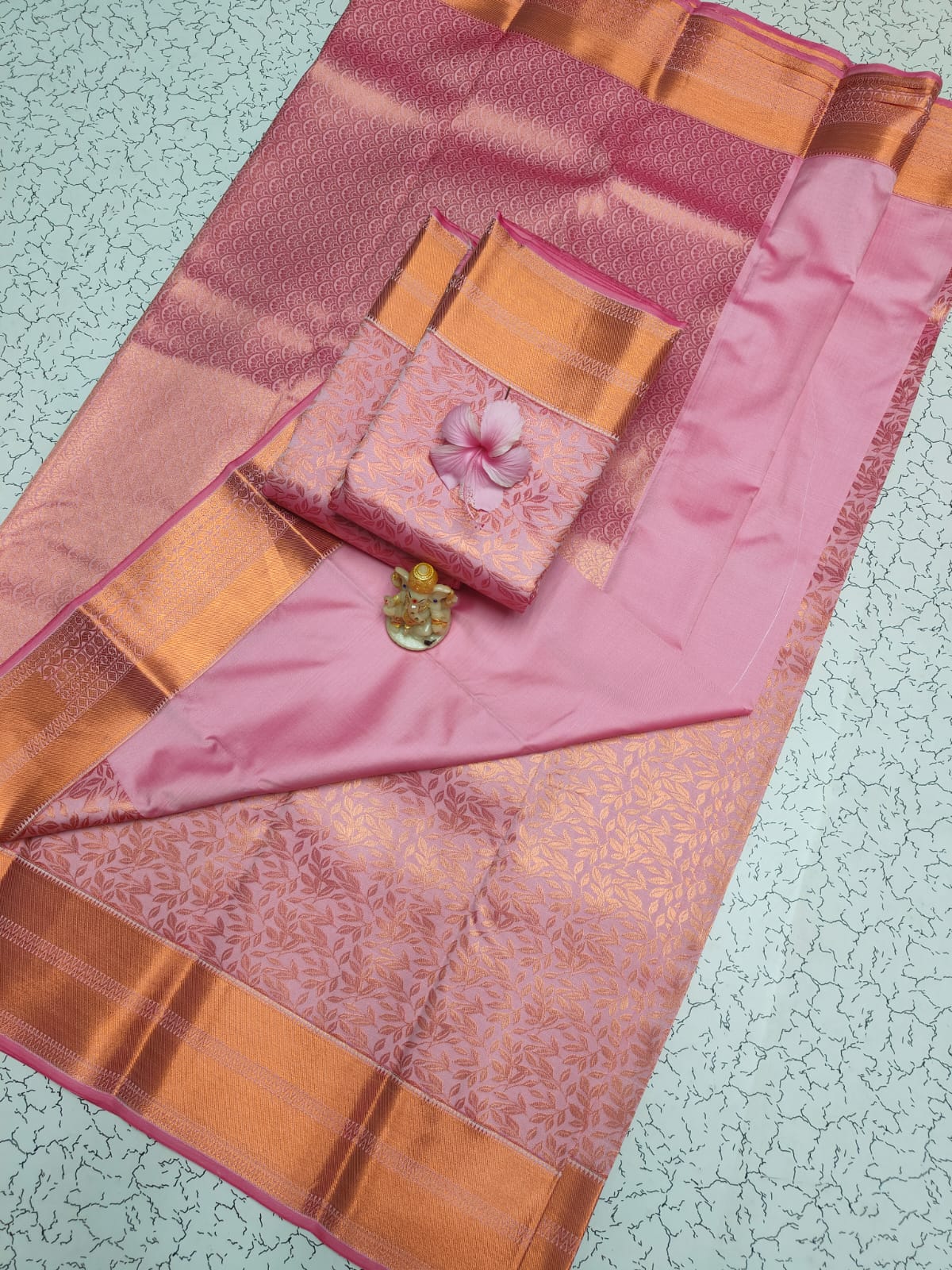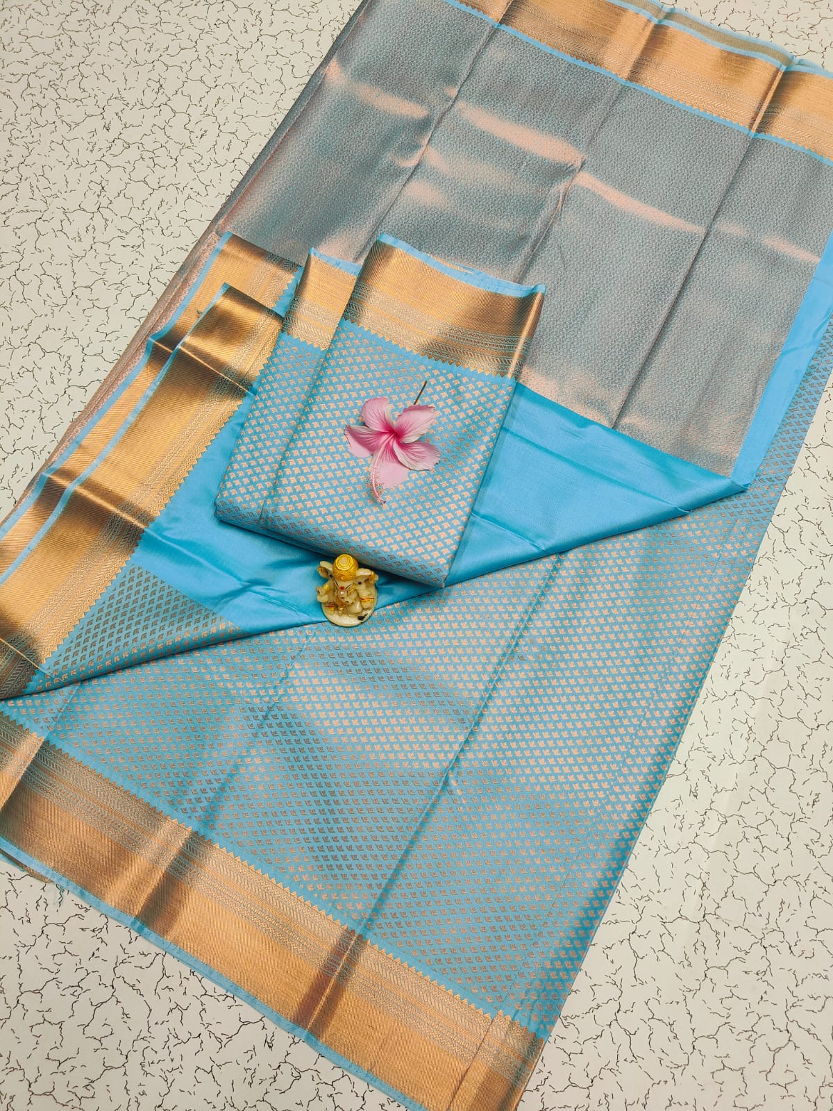Elite Bridal Fancy Silk Saree crafted in pure bridal-grade silk with Samuthrika/Vasthrakala weave. Features a rich contrasting pallu, intricate gold-silver-copper zari, and comes with a matching 110 Karizma blouse.