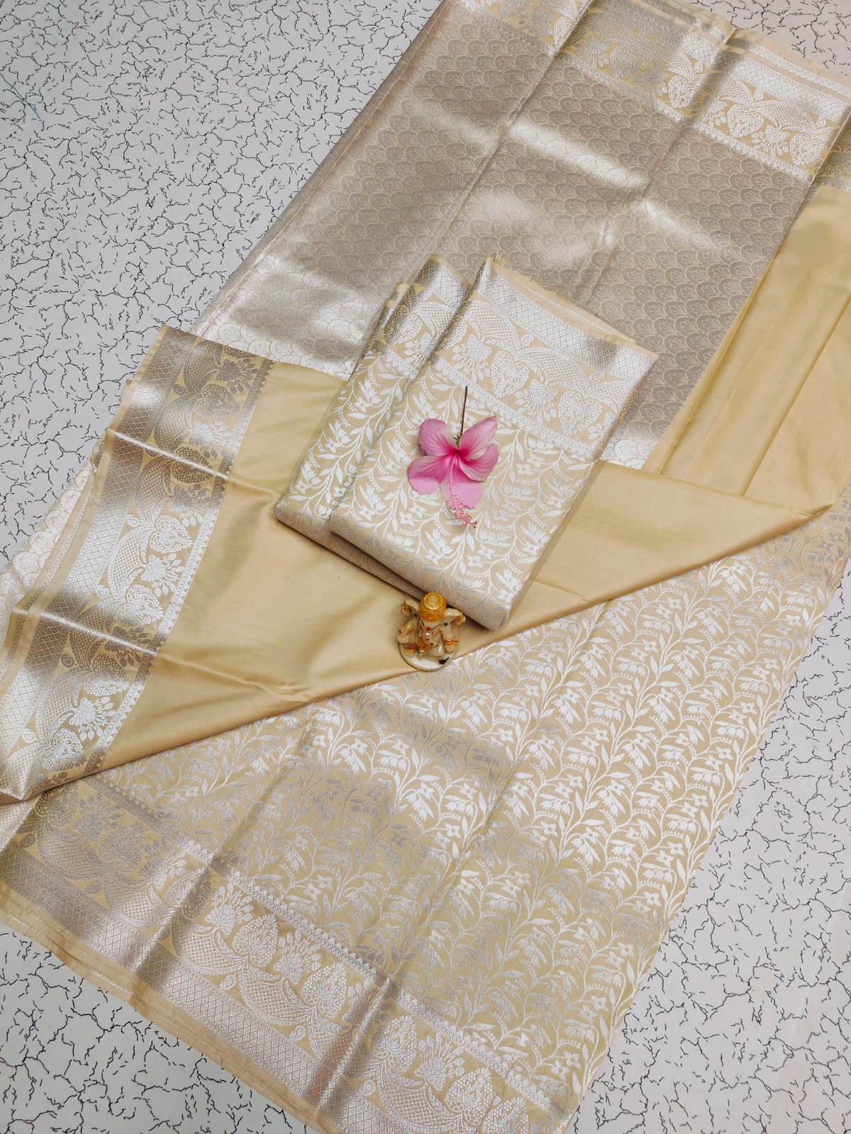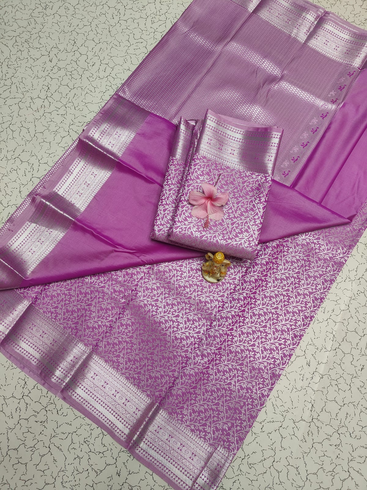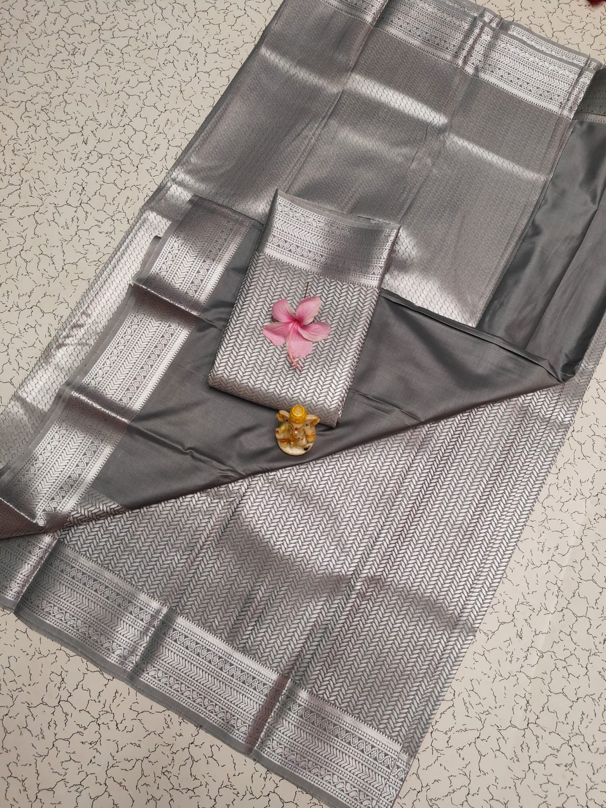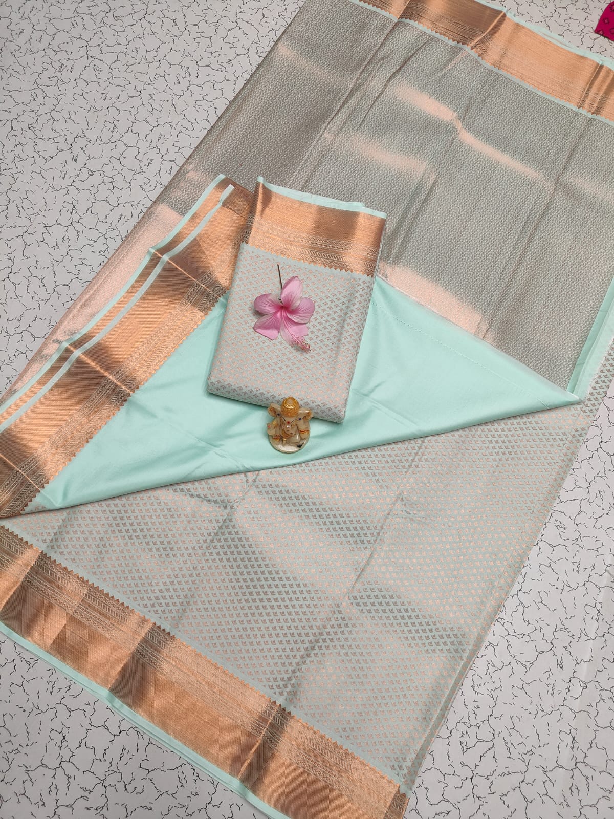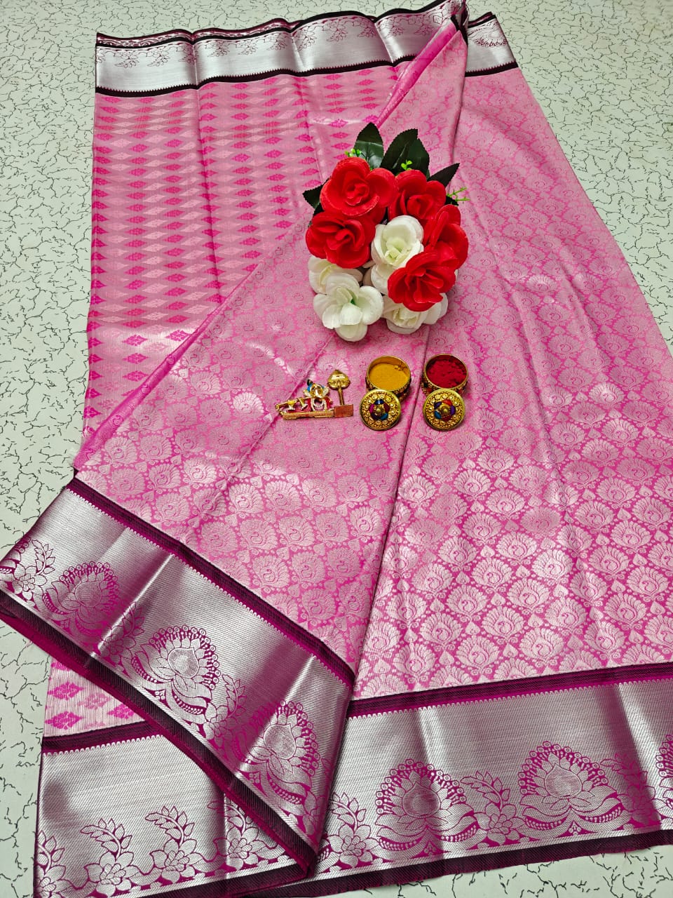 Elite Bridal Fancy Silk Saree crafted in pure bridal-grade silk with Samuthrika/Vasthrakala weave. Features a rich contrasting pallu, intricate gold-silver-copper zari, and comes with a matching 110 Karizma blouse.