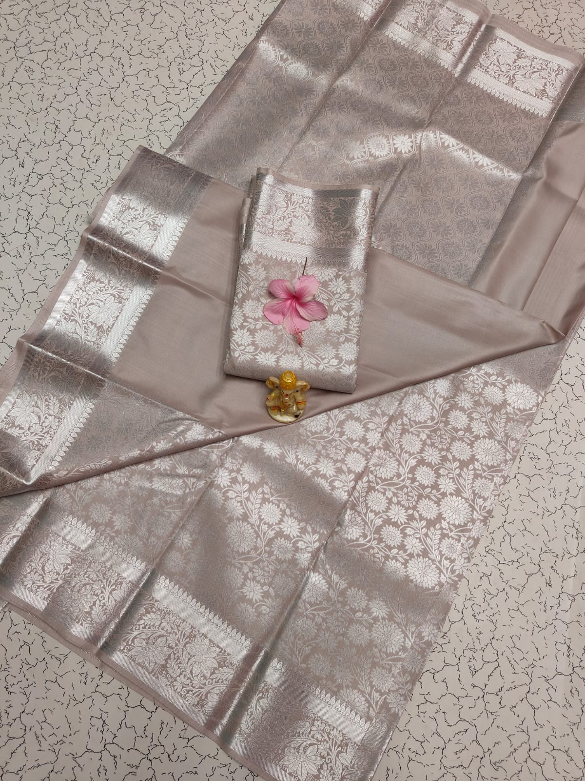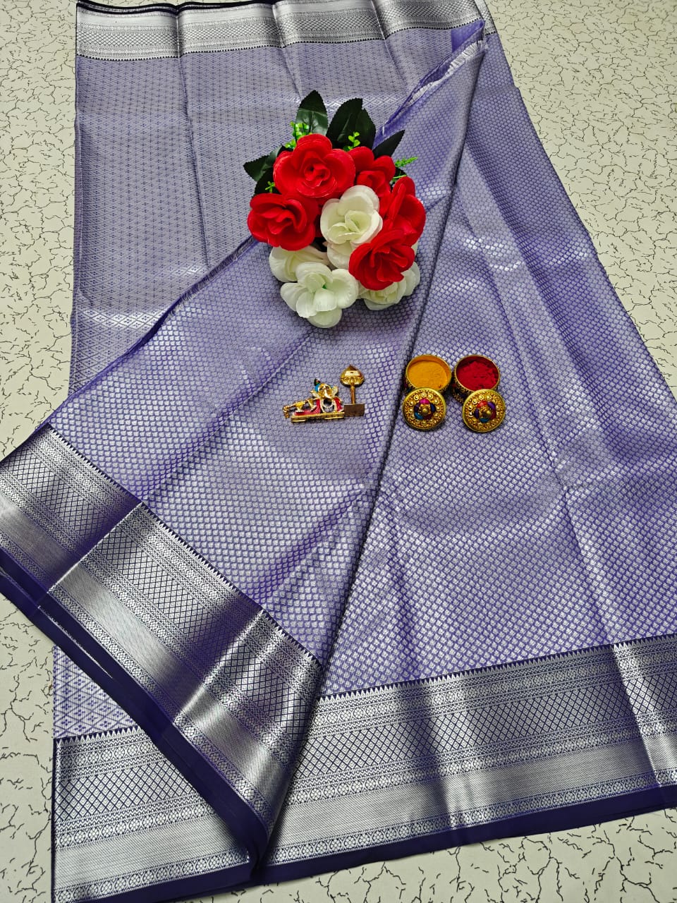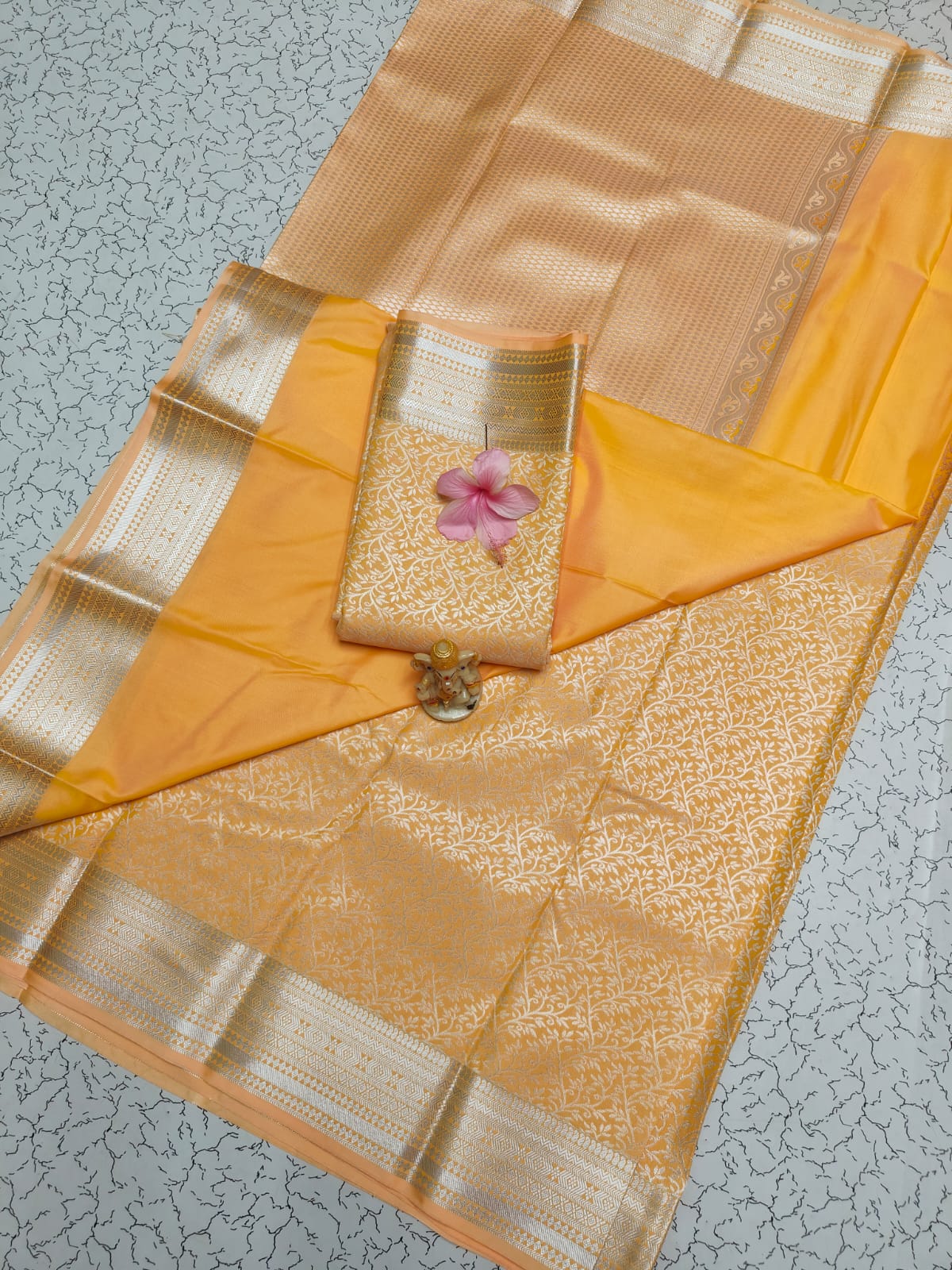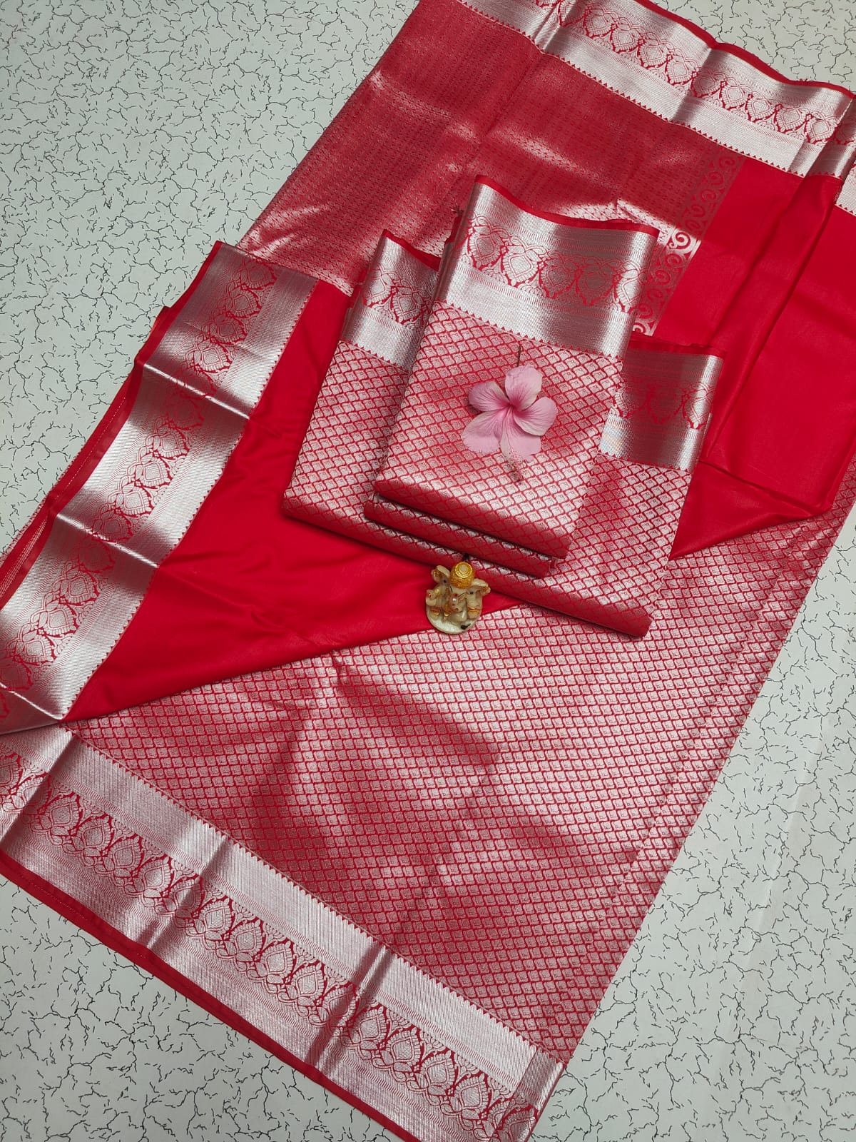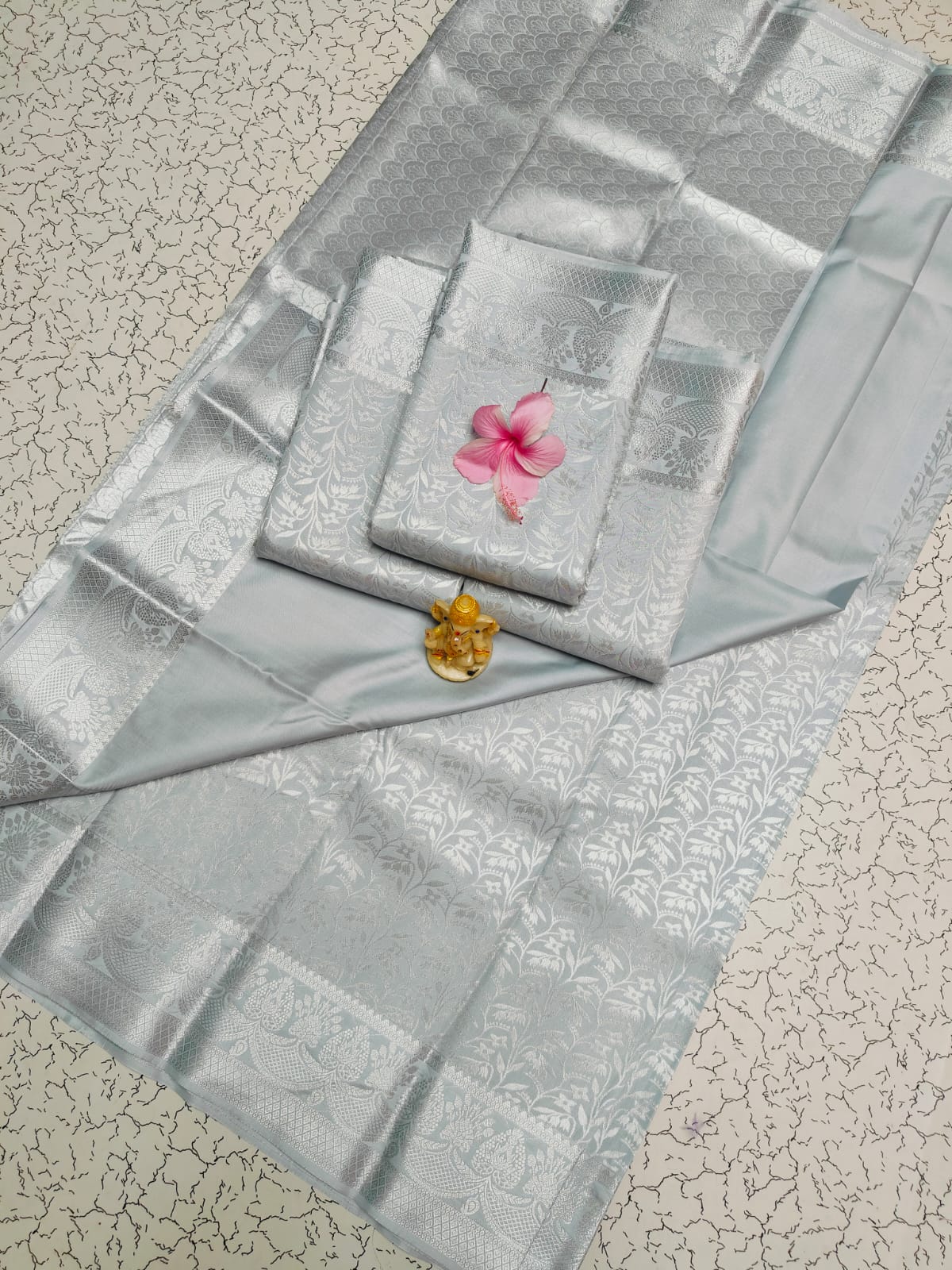 Elite Bridal Fancy Silk Saree crafted in pure bridal-grade silk with Samuthrika/Vasthrakala weave. Features a rich contrasting pallu, intricate gold-silver-copper zari, and comes with a matching 110 Karizma blouse.